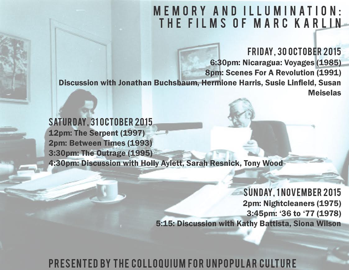 November 20, 2015 Presented by The Colloquium for Unpopular Culture – Memory And Illumination: The Films of Marc Karlin Share this: Click to share on X (Opens in new window) X Click to share on Facebook (Opens in new window) Facebook Like Loading... Related