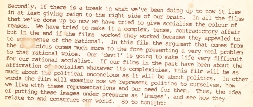 At the time I was completely absorbed in a search for a progressive form of film-making, one which sought a new and adequate form through which to express a revolutionary conception of the world whilst at the same time respecting, or at least holding on to, a perceived need for an element of agit prop – maybe a reinvention of Dziga Vertov. I think there was a rediscovery of the “Workers Films” of the 1920s and ‘30s at the same Edinburgh Festival.